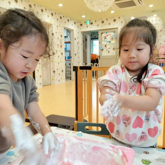 スライム作りに挑戦しました✨おやつの前から「スライム作るんだ~」と楽しみにしている姿が💝スライムの感触をお友達や保育者と楽しんでいましたよ