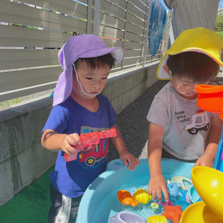 水風船を使って、コンクリートにお絵描きをしたり、玩具で遊んだり楽しんでいました😆